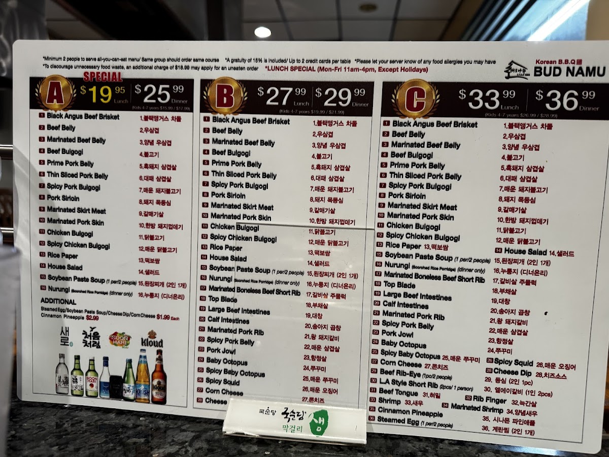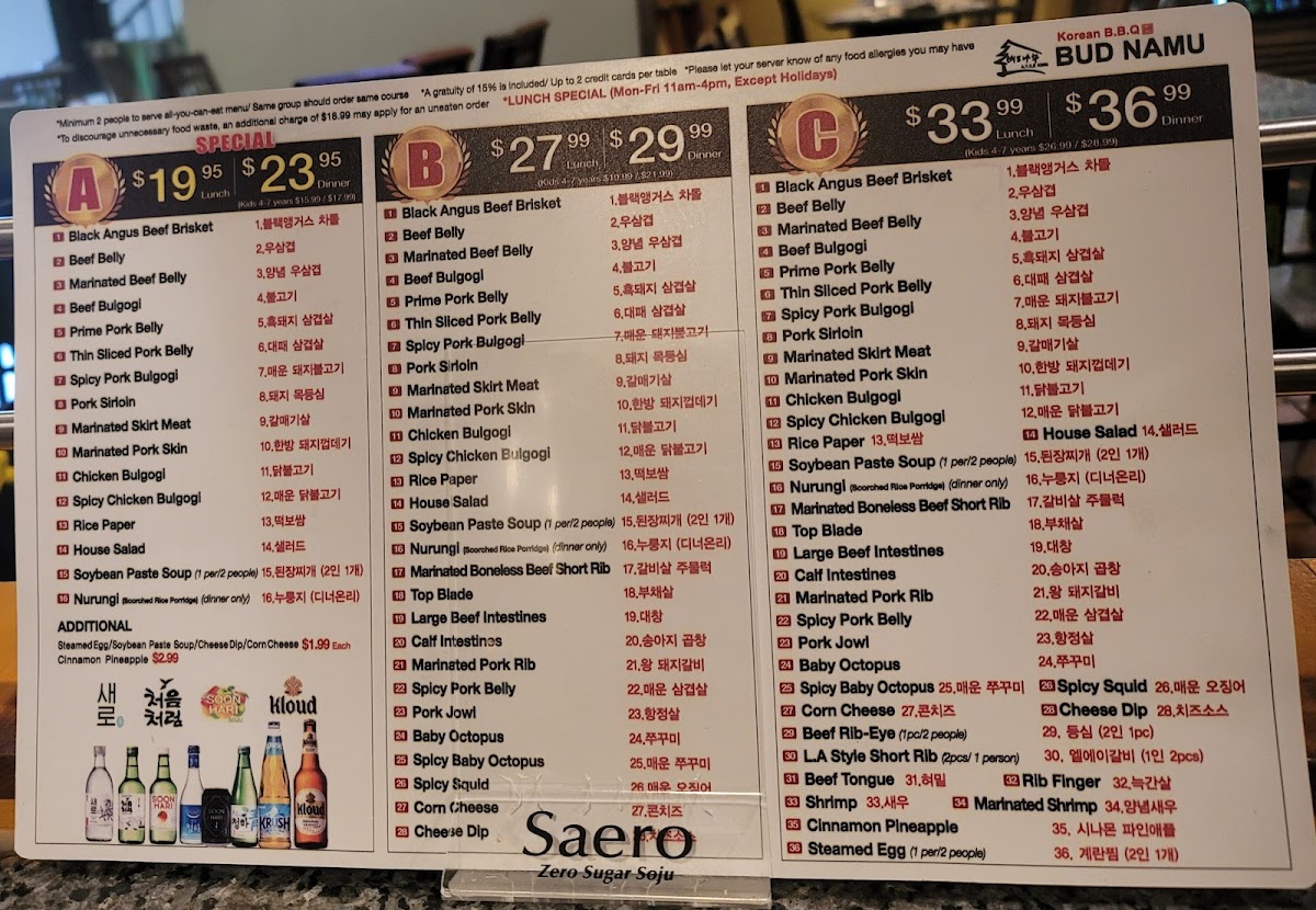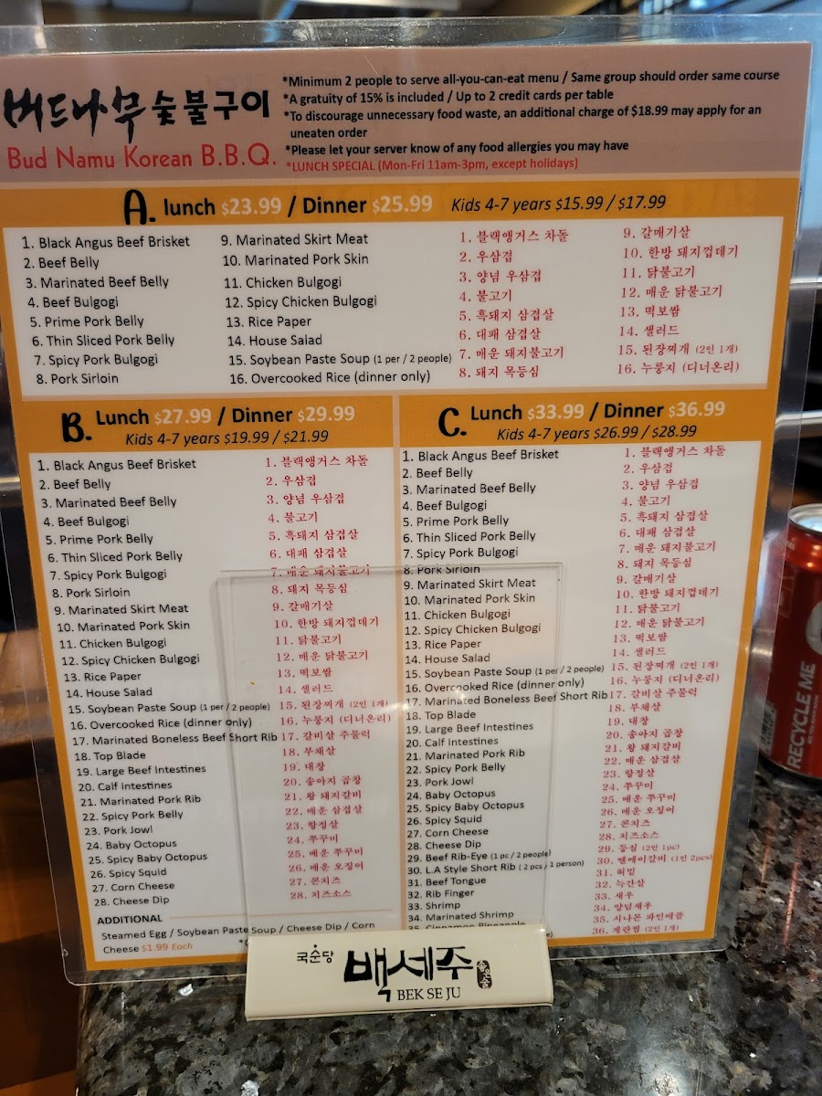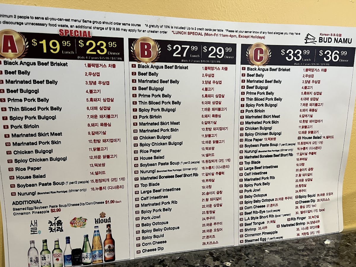 Welcome to Bud Namu, a delightful Korean barbecue experience nestled in the heart of Los Angeles, at 809 S Ardmore Ave. This gem is celebrated for its extensive menu that features an impressive array of dishes, from the savory Bulgogi BBQ to comforting soups like Spicy Seafood Tofu and Galbi Tang. The flavorful marinated meats, such as the tender Chicken Bulgogi and Spicy Pork Belly, are complemented by a vibrant self-serve banchan bar, offering everything from kimchi to macaroni salad.