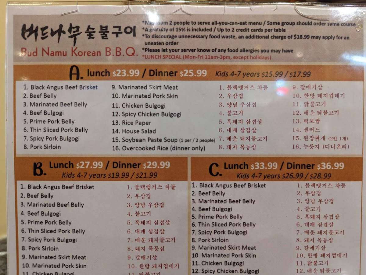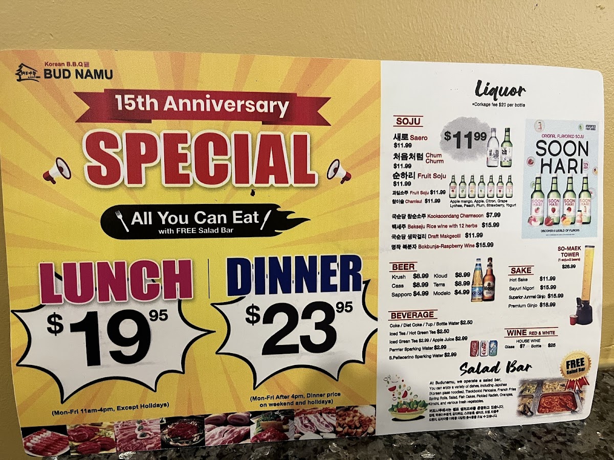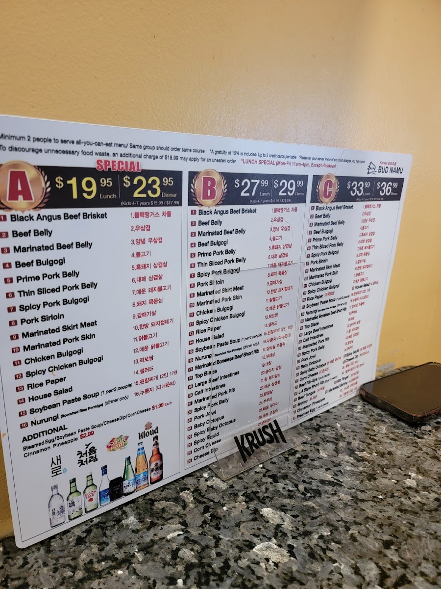 Welcome to Bud Namu, a delightful Korean barbecue experience nestled in the heart of Los Angeles, at 809 S Ardmore Ave. This gem is celebrated for its extensive menu that features an impressive array of dishes, from the savory Bulgogi BBQ to comforting soups like Spicy Seafood Tofu and Galbi Tang. The flavorful marinated meats, such as the tender Chicken Bulgogi and Spicy Pork Belly, are complemented by a vibrant self-serve banchan bar, offering everything from kimchi to macaroni salad.